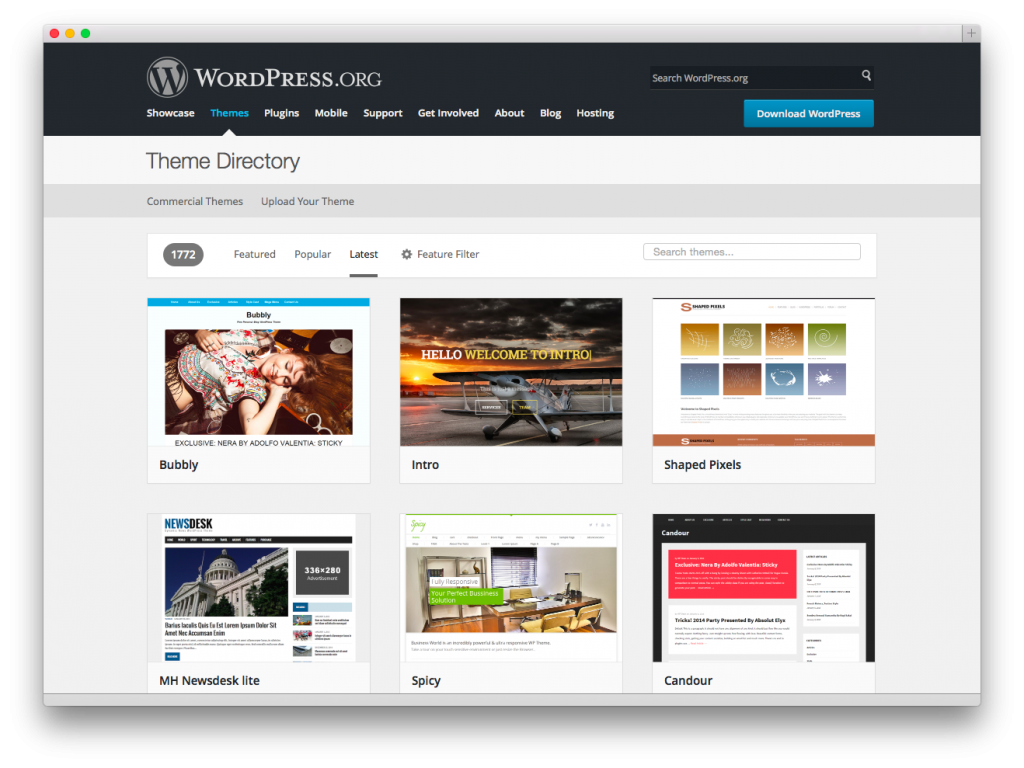 The Theme Directory has a better browsing experience, with handy tabs where you can view featured, popular, and the latest themes. As with the theme experience in your admin, you can use the feature filter to browse for just the right theme for your WordPress website.